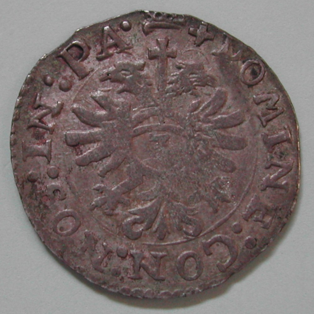 RS: DOMINE:CON:NOS:IN:PA•✚, nimbierter Doppeladler vor Kreuz mit 3 auf Brustschild in feinem Kreis