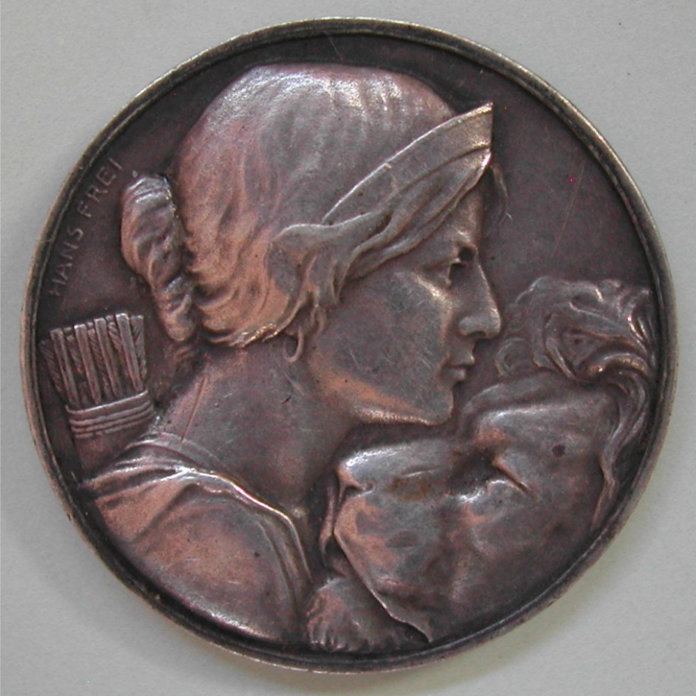AS: Frauenkopf mit Haarknoten küsst Löwen, links Köcher mit Pfeilen, sig: HANS FREI