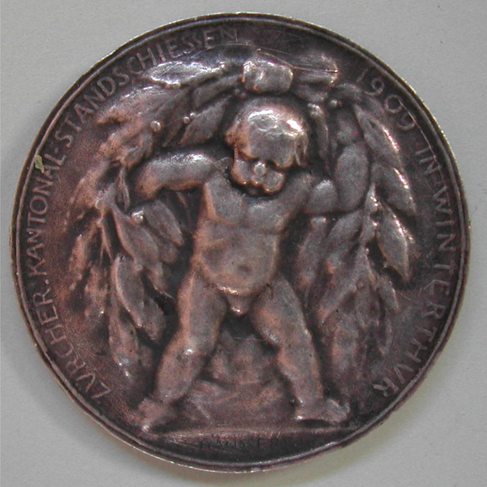 RS: ZÜRCHER.KANTONAL•STANDSCHIESSEN – 1909 IN WINTERTHUR, nackter Knabe stemmt Lorbeerkranz, in Ex sig: HANS FREI