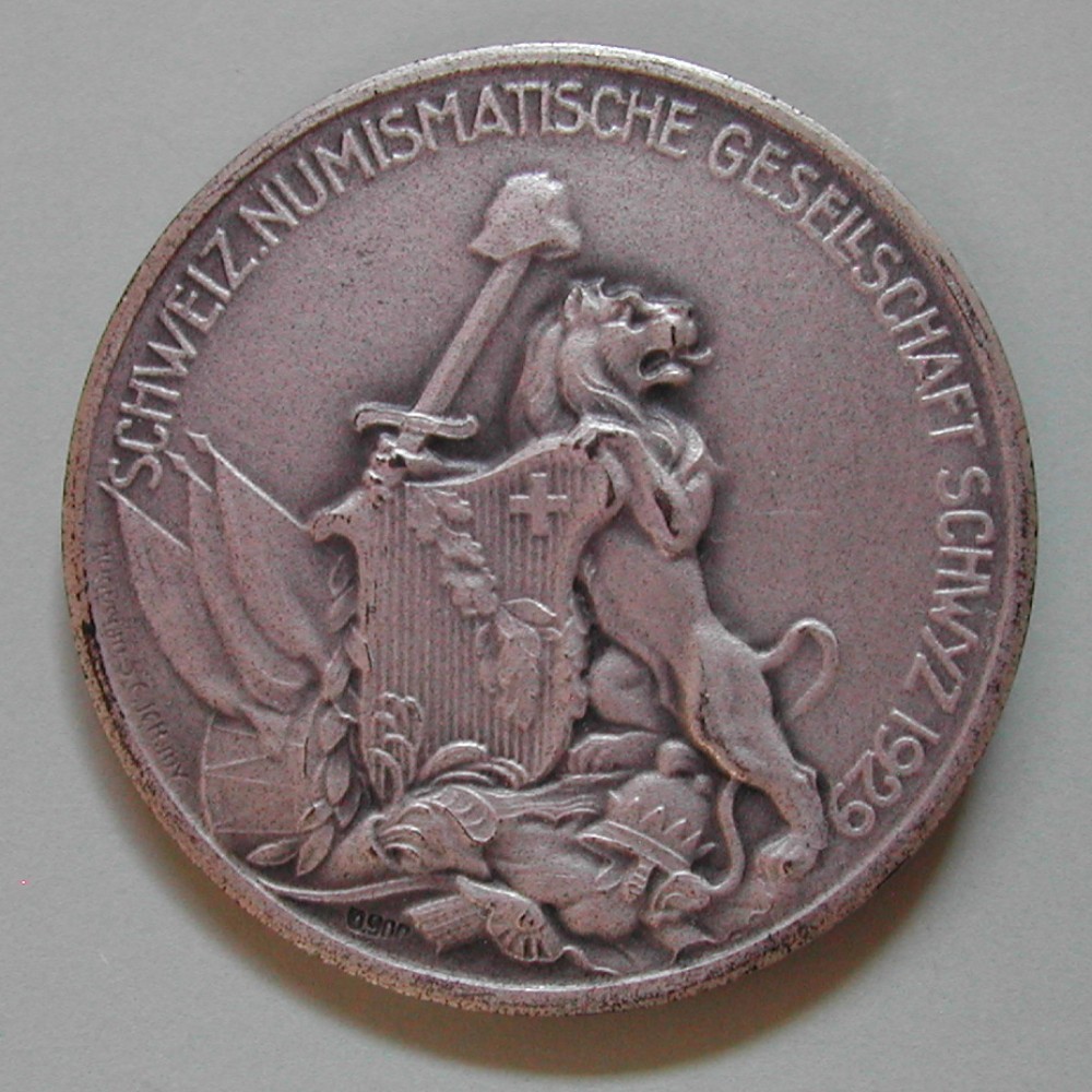 RS: SCHWEIZ.NUMISMATISCHE GESELLSCHAFT SCHWYZ 1929, Löwe mir Freiheitshut auf Schwert das Wappen haltend, Fahnen etc