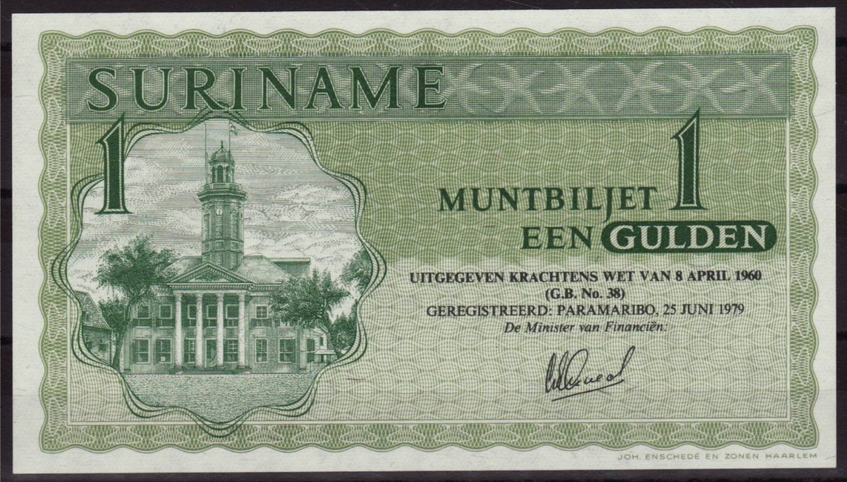 RS: SURINAME, MUNTBILJET 1 EEN GULDEN, links Gebäude mit Säulen und Turm