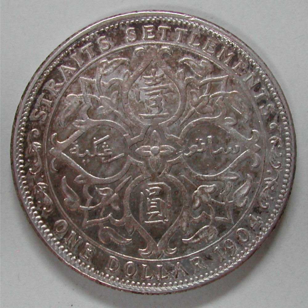RS: STRAITS SETTLEMENTS – ONE DOLLAR 1904 -,reich verzierter Vierpass mit Chinesischen und Malayischen Schriftzeichen