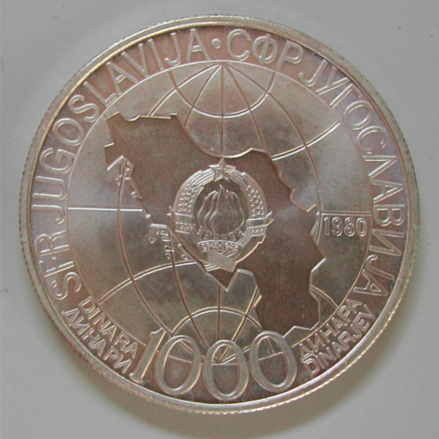RS: SFR JUGOSLAVIJA • CΦPJYΓOCΛABNJA, Umrisse des Landes vor Erdkugel, 1000 DINARA, rechts: 1980