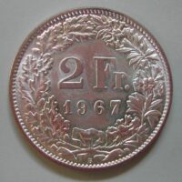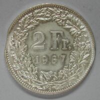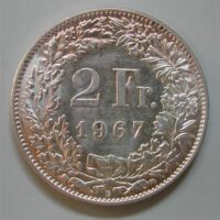 190.00 CHF Weitere Informationen2 FRANKEN 1967 B, Ag 835, 9.82(9) gr., d=27mm, unz, ABART: ZAINENDE
