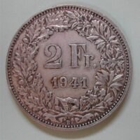 15.00 CHF Weitere Informationen2 FRANKEN 1941 B, SILBER 835, ca 10.03(9) gr., d=27mm, ABART: Prägeschwäche unten AS, ss