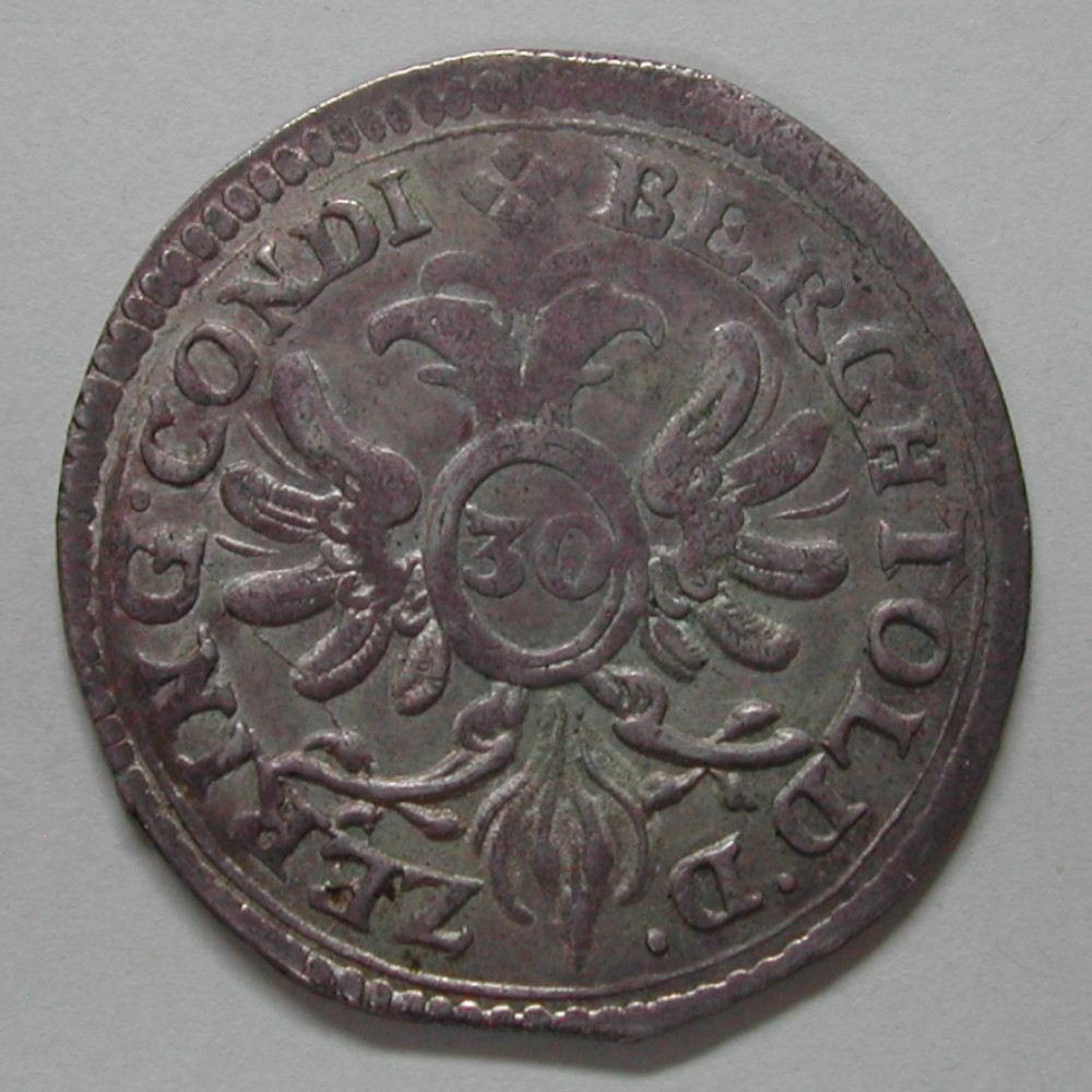 RS: BERCHTOLD ∙ D ∙ – ZERING ∙ CONDI, Doppelköpfiger SAdler frontal, ovaler Brustschild mit der Zahl 30 (30 Kreuzer)