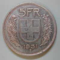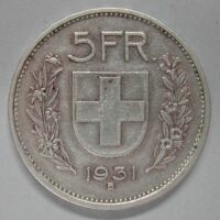 RS: 5 FR. / Wappen / 1931 / B, links Edelweiss, rechts Alpenrose, ABART: Fremdkörpereinprägung im Kreuz