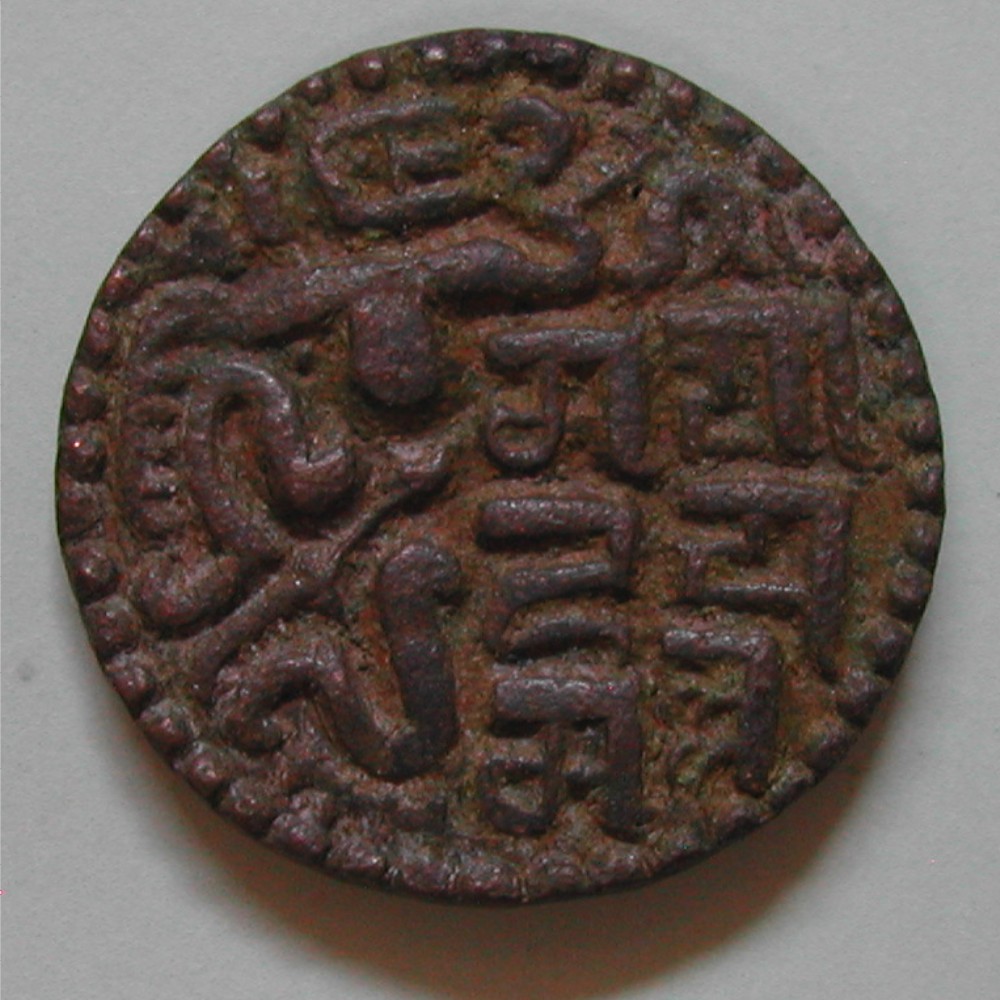 RS: sitzender König nach rechts, rechte Hand hält Muschel, rechts Nagari: Sri mat Sa ha sa Ma lla