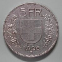 160.00 CHF Weitere InformationenCH, 5 FRANKEN 1926 B (BERN), SILBER 900, ca 25.0 gr., d=37mm, ss, Flecken Kopfseite