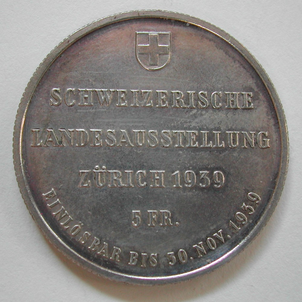 RS: Wappen / SCHWEIZERISCHE / LANDESAUSSTELLUNG / ZÜRICH 1939 / 5 FR. / EINLÖSBAR BIS 30. NOV. 1939