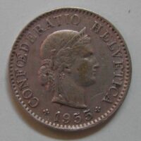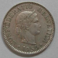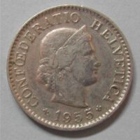 60.00 CHF Weitere Informationen5 RAPPEN 1955 B, CuNi ca 2.00(0) gr., d=17mm, ABART: ca 45° verdreht, ss