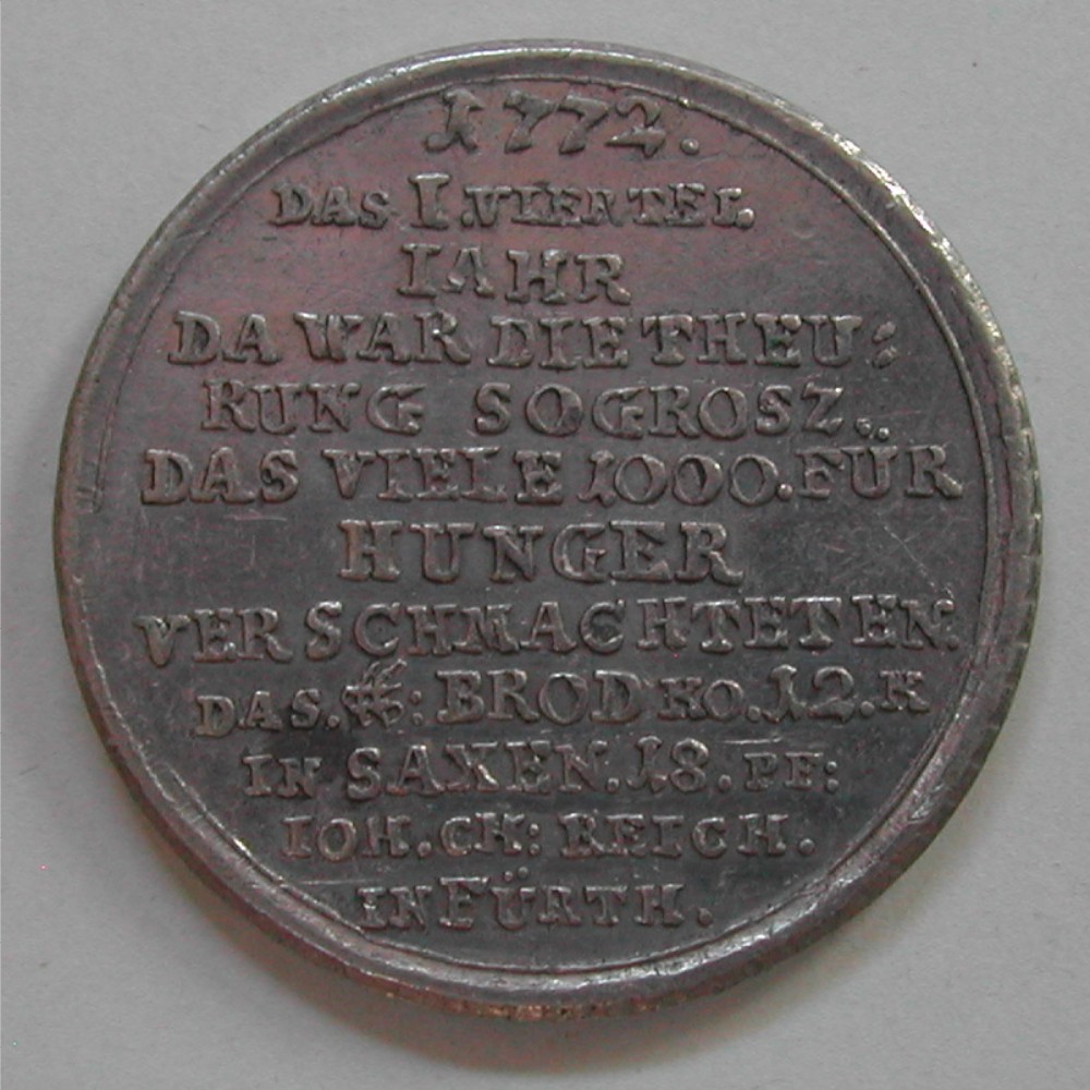 RS: 1772 / 9 Zeilen Schrift über Hungersnot, Preise etc / sig: IOH. CH:REICH. / IN FÜRTH