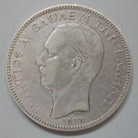 75.00 CHF Weitere InformationenGR, GEORGIOS A! 5 DRACHMEN 1875 A, Ag 900, (25 gr.) d=37mm (LMU), ss