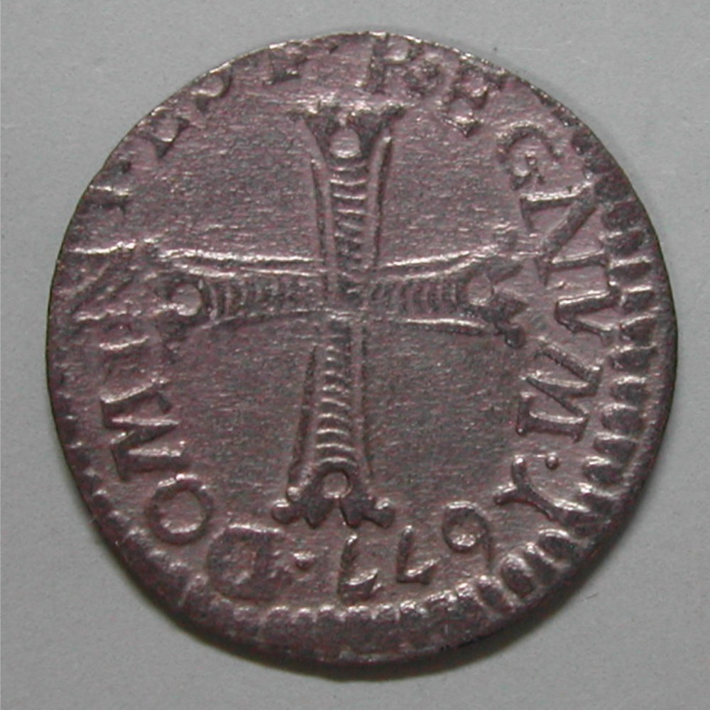 RS: DOMINI • EST • REGNVM • 1677 •, Perlkreis, Kreuz mit offenen Enden und Strichelverzierung