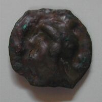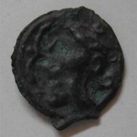 AS: Kopf mit Helm und Haarwulst nach links, vor dem Mund Ranke, obern ●, rechts Torques (?)