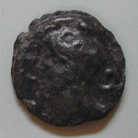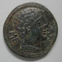 AS: etwas verwilderter Kopf des Herkules nach links, dahinter links seine Keule, Iberische Schrift