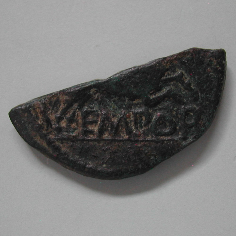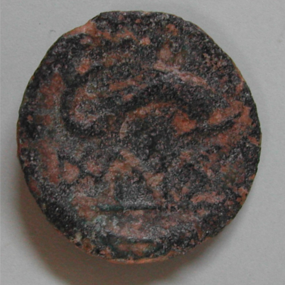 RS: Delphin nach rechts schwimmend, links oben Torques mit Punkt, unten iberische Schrift