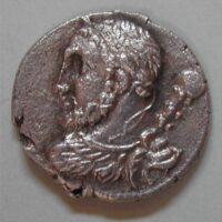 AS: Kopf mit Strahlenkrone nach rechts, wilder Bart und Haare, Trugschrift